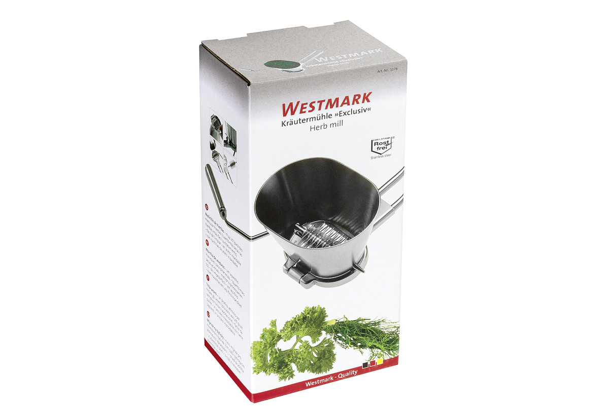 Mit der Kräutermühle 'Exklusiv' zerkleinern Sie im Handumdrehen frische Kräuter und Zwiebeln. Scharfe rotierende Schneidzähne ziehen die Kräuter in das Innere der Mühle und zerkleinern diese mit Edelstahlmessern. Gute Handhabung dank leichtem Gewicht, Haltegriff und Kurbel aus rostfreiem Edelstahl. Das Produkt kann komplett zerlegt werden und ist somit problemlos von Hand zu reinigen. Das Qualitäsprodukt ist spülmaschinengeeignet mit mit 5 Jahren Garantie. Kräutermühle 'Exklusiv', Haltegriff und Kurbel aus rostfreiem Edelstahl, scharfe rotierende Schneidzähne ziehen die Kräuter in das Innere der Mühle und zerkleinern diese mit Edelstahlmessern, gute Handhabung dank leichtem Gewicht, problemlose Reinigung,