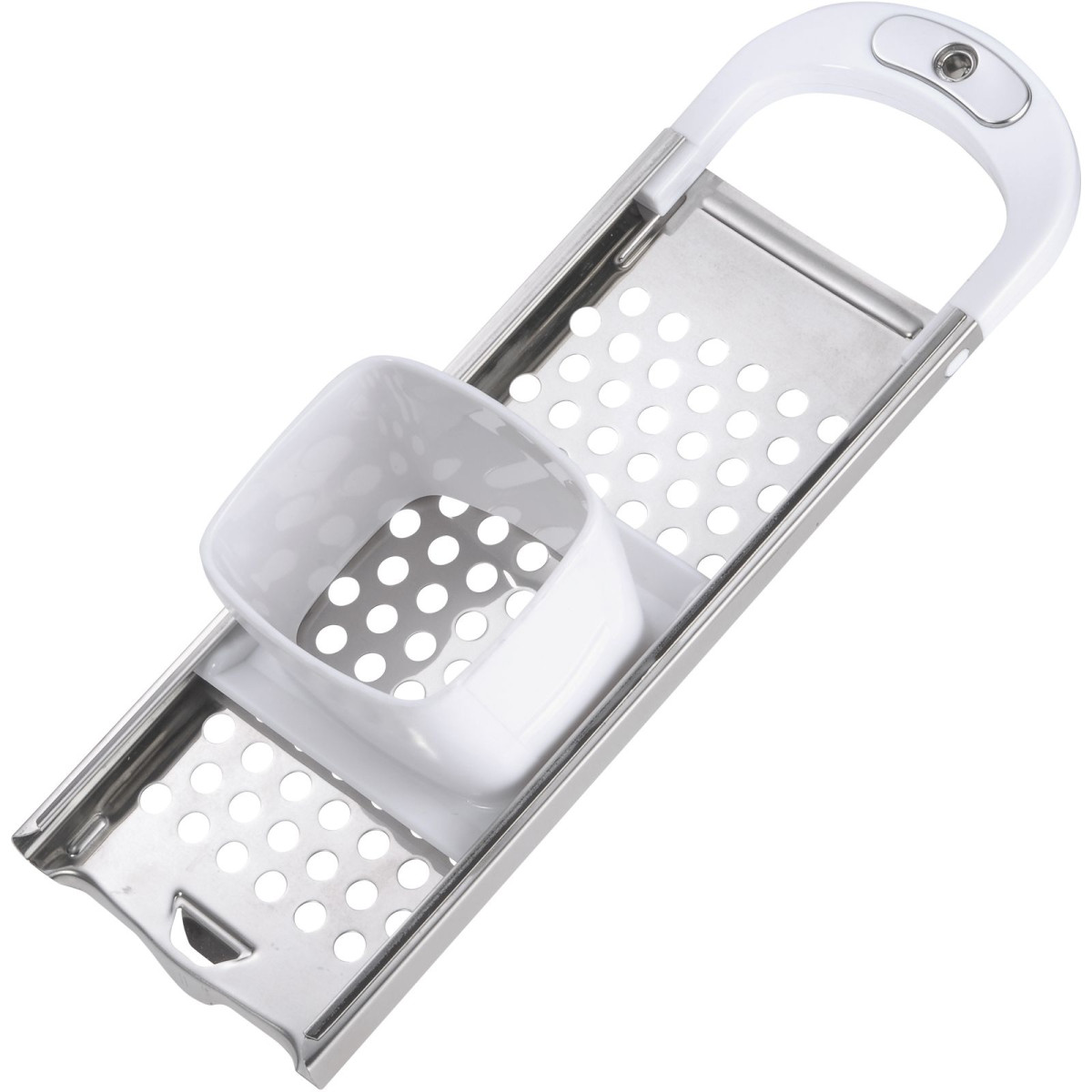 Der Handhobel mit Teigschlitten ist zur einfachen und schnellen Herstellung von Spätzle und Knöpflein in jeder Teigkonsistenz gedacht. Einfaches Einfüllen von Teig in den Kunststoff-Schlitten (Fassungsvermögen 250 ml) und anschließendes Hin- und Hergleiten des Schlittens auf dem gelochten Hobelbrett und Knöpfle und Spätzle sind in Minutenschnelle fertig. Die Auflageraste für Töpfe und Schüsseln bis zu einem Ø von 28 cm und einer Randdicke von bis zu 1,4 cm und der abgerundete Griff aus hochwertigem Kunststoff mit Aufhänge-Öse sorgen für optimalen Halt beim Zubereiten und für platzsparendes Verstauen. Ein bündiger Abschluss zwischen Schlitten und Seiten-Schienen verhindert das Wegfließen des Teiges. Material: Kunststoff / Rostfreier Edelstahl. mit Rundloch für kurze Spätzle