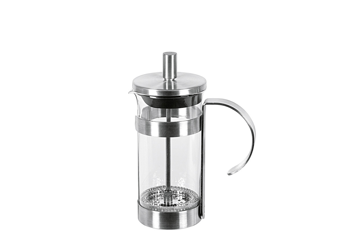 Ein Blickfang ist der Kaffeebereiter von my basics aus transparentem Glas mit satinierten Edelstahlelementen. Er hat ein Fassungsvermögen von 350 ml (ca. zwei Tassen Kaffee) und benötigt keinen Stromanschluss. Sie können den gemahlenen Kaffee in eine Kanne füllen und heißes Wasser hinzugeben. Setzten Sie den Deckel mit integrierter Kaffeepresse auf und drücken Sie nach kurzer Zeit den Hebel vorsichtig hinunter. Mit dem Ausgießer lässt sich der fertige Kaffee in eine Tasse einschenken. Und fertig ist Ihre frische Tasse Kaffee. Der Kaffeebereiter ist spülmaschinengeeignet.