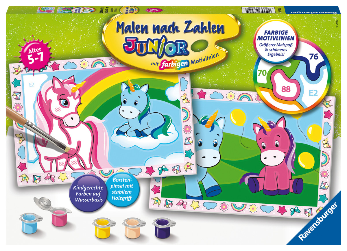 Zauberhafte Einhörner D | Farbige Motivlinien: Größerer Malspaß & ein schöneres Ergebnis! Dank der farbigen Motivlinien, die die Malfelder umranden, können die Kinder das ganze Motiv und die Farben schneller erkennen. Das farbenfrohe Motiv Zauberhafte Einhörner ist eine tolle Geschenkidee für Kinder von 5-7 Jahren und eine schöne Dekoration für das Kinderzimmer. In diesem Malset sind 5 fertig gemischte Acrylfarben und ein Pinsel enthalten.Verpackungsdesign kann abweichen.Mit den Junior Malen nach Zahlen von Ravensburger lernen die Kinder Flächen sorgfältig auszumalen, ihr Maltalent zu verbessern sowie feinmotorische Fähigkeiten zu entwickeln. Am Ende stehen Freude, Stolz und ein Erfolgserlebnis, das die Lust am Weitermalen weckt.Jedes Malset enthält alles, was kleine Künstler zum Malen brauchen und es ist kein Mischen der Farben notwendig.Das Ravensburger Malen nach Zahlen Programm bietet eine große Motivauswahl für Kinder und Erwachsene. | Farbige Motivlinien: Größerer Malspaß & ein schöneres Ergebnis! Dank der farbigen Motivlinien, die die Malfelder umranden, können die Kinder das ganze Motiv und die Farben schneller erkennen. Das farbenfrohe Motiv Zauberhafte Einhörner ist eine tolle Geschenkidee für Kinder von 5-7 Jahren und eine schöne Dekoration für das Kinderzimmer. In diesem Malset sind 5 fertig gemischte Acrylfarben und ein Pinsel enthalten.Verpackungsdesign kann abweichen. | - Auspacken und Losmalen: das Malset ist geeignet für Künstler von 5-7 Jahren und fördert Konzentration und Motorik, - Die farbigen Motivlinien machen kleinere Fehler unsichtbar, erleichtern das Ausmalen und sorgen so für ein schöneres Endergebnis, - Großer Malspaß mit den Lieblingsmotiven der Kinder: Die zauberhaften Einhörner bringen Kinderaugen zum Leuchten und sind somit das ideale Geschenk für kleine und große Künstler, - Die fertig ausgemalten Motive eignen sich wunderbar als Geschenk oder Dekoration im eigenen Kinderzimmer, so dass das Kind noch lange stolz auf sein Kunstwerk sein kann, - Das Malset enthält 5 kindgerechte Farben in wiederverschließbaren und nummerierten Näpfchen, zwei stabile Maltafeln im Format 32 x 22 cm, einen breiten Borstenpinsel und eine Anleitung. Die hochwertigen Acrylfarben trocknen schnell, sind auf Wasserbasis,. Lizenz: | Serie: Arts & Crafts | Preisbindung: N | Verkaufsverpackung: Karton | Geschlecht: Unisex | Spieleranzahl: - | Spieldauer: ca. min | empf. Mindestalter: 5 Jahr(e) | empf. Höchstalter: 7 Jahr(e) | Zolltarifnummer: 32131000 | Ursprungsland: TSCHECHISCHE REPUBLIK | Sprache(n) Verpackung: DE | Sprache(n) Gebrauchsanweisung: DE,EN,FR,IT