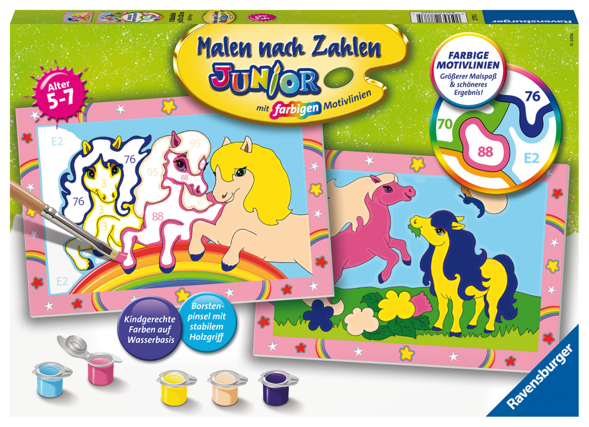 Süße Ponys D | Farbige Motivlinien: Größerer Malspaß & ein schöneres Ergebnis! Dank der farbigen Motivlinien, die die Malfelder umranden, können die Kinder das ganze Motiv und die Farben schneller erkennen. Das farbenfrohe Motiv Süße Ponys ist eine tolle Geschenkidee für Kinder von 5-7 Jahren und eine schöne Dekoration für das Kinderzimmer. In diesem Malset sind 5 fertig gemischte Acrylfarben und ein Pinsel enthalten.Verpackungsdesign kann abweichen.Mit den Junior Malen nach Zahlen von Ravensburger lernen die Kinder Flächen sorgfältig auszumalen, ihr Maltalent zu verbessern sowie feinmotorische Fähigkeiten zu entwickeln. Am Ende stehen Freude, Stolz und ein Erfolgserlebnis, das die Lust am Weitermalen weckt.Jedes Malset enthält alles, was kleine Künstler zum Malen brauchen und es ist kein Mischen der Farben notwendig.Das Ravensburger Malen nach Zahlen Programm bietet eine große Motivauswahl für Kinder und Erwachsene. | Farbige Motivlinien: Größerer Malspaß & ein schöneres Ergebnis! Dank der farbigen Motivlinien, die die Malfelder umranden, können die Kinder das ganze Motiv und die Farben schneller erkennen. Das farbenfrohe Motiv Süße Ponys ist eine tolle Geschenkidee für Kinder von 5-7 Jahren und eine schöne Dekoration für das Kinderzimmer. In diesem Malset sind 5 fertig gemischte Acrylfarben und ein Pinsel enthalten.Verpackungsdesign kann abweichen. | - Auspacken und Losmalen: das Malset ist geeignet für Künstler von 5-7 Jahren und fördert Konzentration und Motorik, - Die farbigen Motivlinien machen kleinere Fehler unsichtbar, erleichtern das Ausmalen und sorgen so für ein schöneres Endergebnis, - Großer Malspaß mit den Lieblingsmotiven der Kinder: Die süßen Ponys bringen Kinderaugen zum Leuchten und sind somit das ideale Geschenk für kleine und große Künstler, - Die fertig ausgemalten Motive eignen sich wunderbar als Geschenk oder Dekoration im eigenen Kinderzimmer, so dass das Kind noch lange stolz auf sein Kunstwerk sein kann, - Das Malset enthält 5 kindgerechte Farben in wiederverschließbaren und nummerierten Näpfchen, zwei stabile Maltafeln im Format 32 x 22 cm, einen breiten Borstenpinsel und eine Anleitung. Die hochwertigen Acrylfarben trocknen schnell, sind auf Wasserbasis,. Lizenz: | Serie: Arts & Crafts | Preisbindung: N | Verkaufsverpackung: Karton | Geschlecht: Unisex | Spieleranzahl: - | Spieldauer: ca. min | empf. Mindestalter: 5 Jahr(e) | empf. Höchstalter: 7 Jahr(e) | Zolltarifnummer: 32131000 | Ursprungsland: TSCHECHISCHE REPUBLIK | Sprache(n) Verpackung: DE | Sprache(n) Gebrauchsanweisung: DE,EN,FR,IT