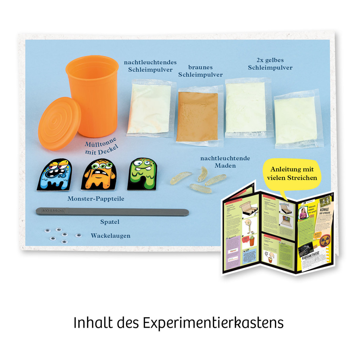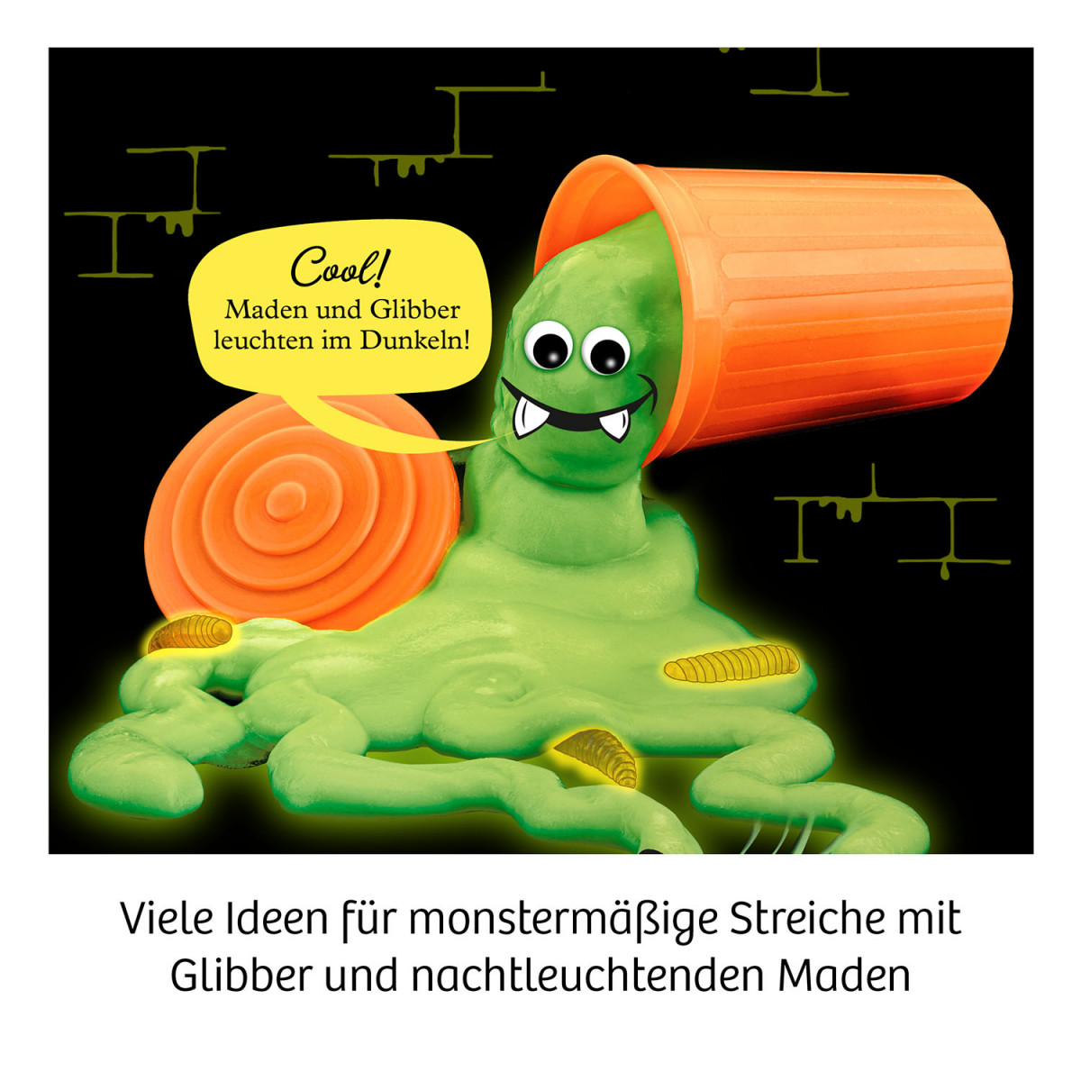 Schleimiger Schreck! Mit diesem KOSMOS Experimentierset sind Freunde und Verwandte bald nirgendwo mehr sicher vor ekeligen Streichen. Maden, die im Dunkeln leuchten, wabbelige Kackhaufen, ein Taschentuch voller Schnodder oder knallige Pupsgeräusche lauern hinter jeder Ecke. Die Glibber-Masse wird in einer genialen Mini-Mülltonne angemischt. Kinder von 8 bis 12 Jahren lernen, warum Menschen sich ekeln, und testen es direkt durch eine selbst gebaute Ekel-Fühl-Box. Neben dem Streiche-Spaß wird auch geforscht: Bei einem Glibber-Spiel können Kinder damit experimentieren, wie sie die kleinen Monster mit Hilfe des Schleims in die Mülltonne befördern. Ein ideales Mitbringsel, sowohl als Geburtstagsgeschenk oder als kleiner Scherzartikel für zwischendurch. |. Lizenz: | Verkaufsverpackung: Kartonschachtel | Geschlecht: Unisex | empf. Mindestalter: 8 Jahr(e) | empf. Höchstalter: 12 Jahr(e) | Spieleranzahl: - | Spieldauer: | Zolltarifnummer: 95030070 | Ursprungsland: TAIWAN, PROVINZ VON CHINA | Sprache(n) Warnhinweise: DE | Verkaufsfähig in:
