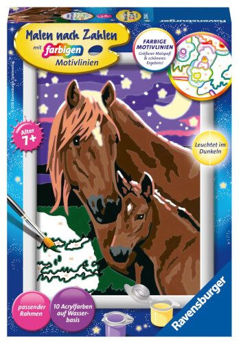 Pferde D | Farbige Motivlinien: Größerer Malspaß & ein schöneres Ergebnis!Dank der farbigen Motivlinien, können die Kinder das ganze Motiv Pferde und die Farben schneller erkennen. Der Pinsel hat eine gute Führung und so entsteht ein perfektes Bild.Die schönen Motive zum Ausmalen sind eine tolle Geschenkidee für Kinder ab 7 Jahren und eine schöne Dekoration. In diesem Malset sind bereits 10 fertig gemischte Acrylfarben enthalten. Verpackungsdesign kann abweichen. Mit Malen nach Zahlen von Ravensburger lernen die Kinder Flächen sorgfältig auszumalen, ihr Maltalent zu verbessern sowie feinmotorische Fähigkeiten zu entwickeln. Am Ende stehen Freude, Stolz und ein Erfolgserlebnis, das die Lust am Weitermalen weckt.Die Motive sind altersgerecht in drei Schwierigkeitsstufen umgesetzt: von einfachen Bildern mit wenigen, großen Malflächen bis hin zu Bildern mit vielen, kleinen Malflächen für Fortgeschrittene.Jedes Malset enthält alles, was Künstler zum Malen brauchen und es ist kein Mischen der Farben notwendig. Zusätzlich zur Maltafel, zu den Farben und zum Pinsel, ist in diesem Malset Leuchtfarbe enthalten. Mit dieser werden besondere Akzente auf das fertig gemalte Bild gesetzt, die im Dunkeln leuchten und strahlen.Das Ravensburger Malen nach Zahlen Programm bietet eine große Motivauswahl für Kinder und Erwachsene. | Farbige Motivlinien: Größerer Malspaß & ein schöneres Ergebnis!Dank der farbigen Motivlinien, können die Kinder das ganze Motiv Pferde und die Farben schneller erkennen. Der Pinsel hat eine gute Führung und so entsteht ein perfektes Bild.Die schönen Motive zum Ausmalen sind eine tolle Geschenkidee für Kinder ab 7 Jahren und eine schöne Dekoration. In diesem Malset sind bereits 10 fertig gemischte Acrylfarben enthalten. Verpackungsdesign kann abweichen. | - Auspacken und Losmalen: das Malset ist geeignet für Künstler ab 7 Jahren, - Die farbigen Motivlinien machen kleinere Fehler unsichtbar, erleichtern das Ausmalen und sorgen so für ein schöneres Endergebnis, - Großer Malspaß mit den Lieblingsmotiven der Kinder: Die Pferde bringen Kinderaugen zum Leuchten und sind somit das ideale Geschenk für kleine und große Künstler, - Dank des mitgelieferten Rahmens eignet sich das Malen nach Zahlen auch wunderbar als Dekoration im eigenen Kinderzimmer, - Das Malset enthält 10 kindgerechte Acrylfarben in wiederverschließbaren und nummerierten Näpfchen, eine stabile Maltafel im Format 13,00 cm x 18,00 cm, einen passenden Rahmen und einen Pinsel. Die hochwertigen Acrylfarben trocknen schnell, sind auf Wasser. Lizenz: | Serie: Arts & Crafts | Preisbindung: N | Verkaufsverpackung: Karton | Geschlecht: Unisex | Spieleranzahl: - | Spieldauer: ca. min | empf. Mindestalter: 7 Jahr(e) | empf. Höchstalter: 99 Jahr(e) | Zolltarifnummer: 32131000 | Ursprungsland: TSCHECHISCHE REPUBLIK | Sprache(n) Verpackung: DE | Sprache(n) Gebrauchsanweisung: DE,FR,IT