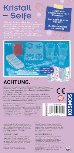 Hände waschen ist wichtig und ab jetzt macht es richtig Spaß! Mit dem Experimentierset Kristall-Seife können Kinder ihre eigene, wunderschöne Seife herstellen. Das ist nicht nur eine tolle Dekoration für das Bad, sondern kann auch zum besonderen „handmade“-Geschenk für Freunde und Familie werden. Echte Rohseife wird mit Wärme verflüssigt und dann in den beiliegenden Messbechern mit Kosmetikfarbe zu einem leuchtenden Rot gefärbt. Eine Pipette hilft beim Dosieren und der Spatel sorgt dafür, dass alles gut vermischt werden kann. In kleinen Schritten entsteht ein individueller Farbverlauf und danach wird der Kristall nach Anleitung in seine Form geschnitzt. Aber natürlich können die Kinder auch selber kreativ werden. Der Clou: Alle Reste einfach wieder einschmelzen und in die vier Mini-Seifenformen gießen! Auf geht’s! Das Set enthält die wichtigsten Utensilien für die kleinen Forscher*innen. Nur noch ein Marmeladenglas und eine Mikrowelle oder ein Wasserbad werden benötigt. Das farbige Anleitungsblatt beschreibt alles Schritt für Schritt und hält kleine Zusatzinfos rund um Seife & Co. bereit. |. Lizenz: | Verkaufsverpackung: Kartonschachtel | Geschlecht: Unisex | empf. Mindestalter: 8 Jahr(e) | empf. Höchstalter: 12 Jahr(e) | Spieleranzahl: - | Spieldauer: | Zolltarifnummer: 95030070 | Ursprungsland: DEUTSCHLAND, BUNDESREPUBLIK | Sprache(n) Warnhinweise: DE | Verkaufsfähig in: