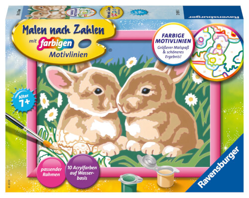 Niedliche Häschen D | Farbige Motivlinien: Größerer Malspaß & ein schöneres Ergebnis!Dank der farbigen Motivlinien, können die Kinder das ganze Motiv Niedliche Häschen und die Farben schneller erkennen. Der Pinsel hat eine gute Führung und so entsteht ein perfektes Bild.Die schönen Motive zum Ausmalen sind eine tolle Geschenkidee für Kinder ab 7 Jahren und eine schöne Dekoration. In diesem Malset sind bereits 10 fertig gemischte Acrylfarben enthalten. Verpackungsdesign kann abweichen. Mit Malen nach Zahlen von Ravensburger lernen die Kinder Flächen sorgfältig auszumalen, ihr Maltalent zu verbessern sowie feinmotorische Fähigkeiten zu entwickeln. Am Ende stehen Freude, Stolz und ein Erfolgserlebnis, das die Lust am Weitermalen weckt.Die Motive sind altersgerecht in drei Schwierigkeitsstufen umgesetzt: von einfachen Bildern mit wenigen, großen Malflächen bis hin zu Bildern mit vielen, kleinen Malflächen für Fortgeschrittene.Jedes Malset enthält alles, was Künstler zum Malen brauchen und es ist kein Mischen der Farben notwendig.Das Ravensburger Malen nach Zahlen Programm bietet eine große Motivauswahl für Kinder und Erwachsene. | Farbige Motivlinien: Größerer Malspaß & ein schöneres Ergebnis!Dank der farbigen Motivlinien, können die Kinder das ganze Motiv Niedliche Häschen und die Farben schneller erkennen. Der Pinsel hat eine gute Führung und so entsteht ein perfektes Bild.Die schönen Motive zum Ausmalen sind eine tolle Geschenkidee für Kinder ab 7 Jahren und eine schöne Dekoration. In diesem Malset sind bereits 10 fertig gemischte Acrylfarben enthalten. Verpackungsdesign kann abweichen. | - Auspacken und Losmalen: das Malset ist geeignet für Künstler ab 7 Jahren, - Die farbigen Motivlinien machen kleinere Fehler unsichtbar, erleichtern das Ausmalen und sorgen so für ein schöneres Endergebnis, - Großer Malspaß mit den Lieblingsmotiven der Kinder: Die süßen Häschen bringen Kinderaugen zum Leuchten und sind somit das ideale Geschenk für kleine und große Künstler, - Dank des mitgelieferten Rahmens eignet sich das Malen nach Zahlen auch wunderbar als Dekoration im eigenen Kinderzimmer, - Das Malset enthält 10 kindgerechte Acrylfarben in wiederverschließbaren und nummerierten Näpfchen, eine stabile Maltafel im Format 18,00 cm x 13,00 cm, einen passenden Rahmen und einen Pinsel. Die hochwertigen Acrylfarben trocknen schnell, sind auf Wasser. Lizenz: | Serie: Arts & Crafts | Preisbindung: N | Verkaufsverpackung: Karton | Geschlecht: Unisex | Spieleranzahl: - | Spieldauer: ca. min | empf. Mindestalter: 7 Jahr(e) | empf. Höchstalter: 99 Jahr(e) | Zolltarifnummer: 32131000 | Ursprungsland: TSCHECHISCHE REPUBLIK | Sprache(n) Verpackung: DE | Sprache(n) Gebrauchsanweisung: DE