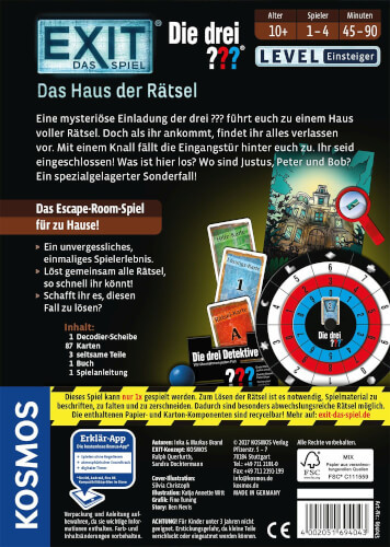 Die drei ??? haben zum Detektivtreffen ins „Haus der Rätsel“ eingeladen. Doch die Gäste finden das Haus verlassen vor. Plötzlich hören sie Schreie und bemerken, dass der Eingang hinter ihnen verschlossen ist. Was ist los? Wo sind Justus, Peter und Bob? Gelingt es euch den Fall zu lösen und den Ausgang zu finden? Mit der Reihe „EXIT® – Das Spiel“ bringt KOSMOS das Gefühl der Live-Escape-Rooms zu euch nach Hause. Jede Box bietet einer Gruppe von 1 bis 4 Personen ein außergewöhnliches Spielerlebnis für einen einmaligen und absolut unvergesslichen Abend! Der Wettlauf gegen die Zeit und die cleveren Rätsel dieser innovativen Spielreihe sorgen für Spannung und geistige Herausforderung in den eigenen vier Wänden. Um die Rätsel zu lösen und sich somit gemeinsam aus der misslichen Lage zu befreien ist Teamgeist gefragt! Also arbeitet gut zusammen, denn die Zeit läuft… Live-Escape-Feeling im Einsteiger-Level. Inhalt: 1 Decodier-Scheibe, 87 Karten, 3 seltsame Teile, 1 Buch, 1 Spielanleitung | Die drei ??? haben zum Detektivtreffen ins „Haus der Rätsel“ eingeladen. Doch die Gäste finden das Haus verlassen vor. Plötzlich hören sie Schreie und bemerken, dass der Eingang hinter ihnen verschlossen ist. Was ist los? Wo sind Justus, Peter und Bob? Gelingt es den Spielern den Fall zu lösen und den Ausgang zu finden? Live-Escape-Feeling im Einsteiger-Level für 1 – 4 Spieler ab 10 Jahren.. Lizenz: | Verkaufsverpackung: Kartonschachtel | Geschlecht: Unisex | empf. Mindestalter: 10 Jahr(e) | empf. Höchstalter: 99 Jahr(e) | Spieleranzahl: 1 - 4 | Spieldauer: 60 - 90 Min. | Zolltarifnummer: 95049080 | Ursprungsland: DEUTSCHLAND, BUNDESREPUBLIK | Sprache(n) Warnhinweise: DE | Verkaufsfähig in: DE