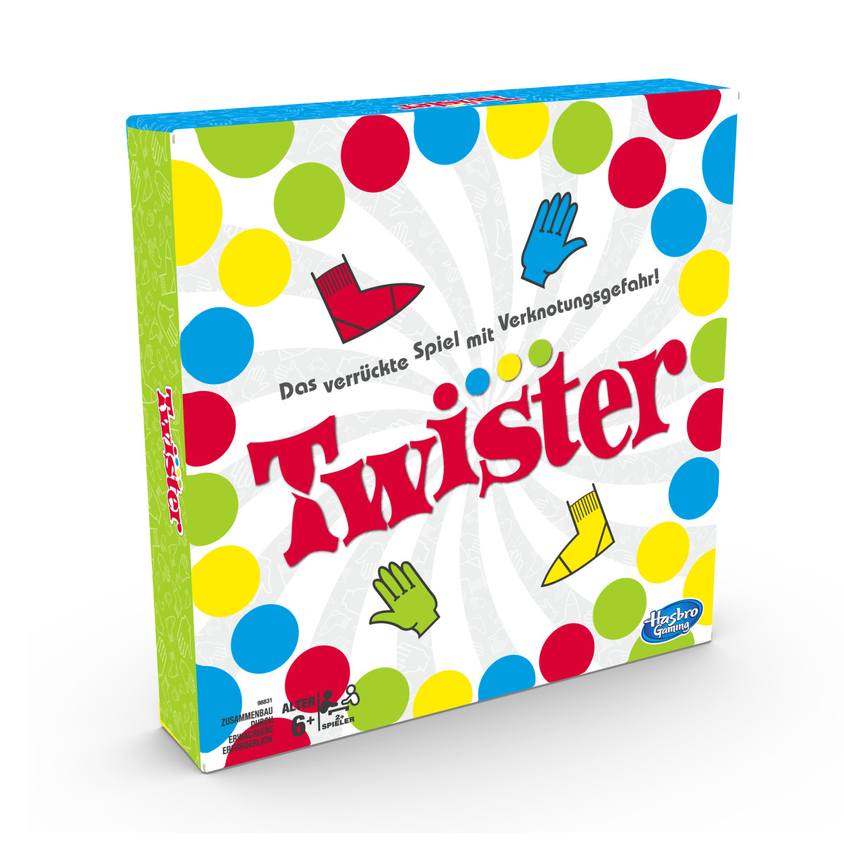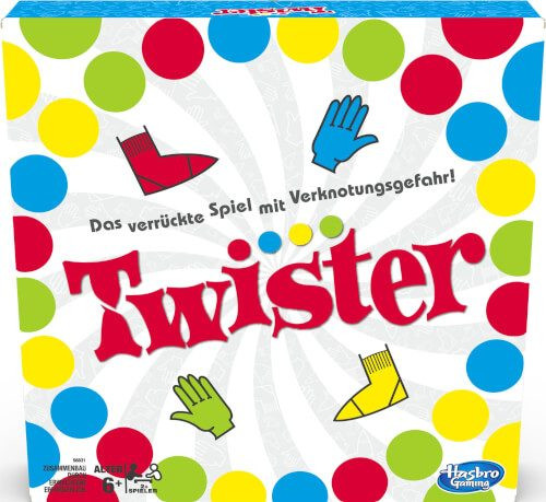 Mit Twister wird jede Party und jeder Spielnachmittag zum Hit. Das verrückte Spiel mit Verknotungsgefahr sorgt für jede Menge lustigen Verbiegespaß. Der Schiri dreht die Scheibe, während die Spieler versuchen, mit Händen und Füßen auf der Matte zu bleiben. Rechter Fuß auf Rot – wer schafft das? Linker Fuß auf Grün – wer bleibt stehen? Sobald ein Spieler mit seinem Knie oder Ellbogen die Matte berührt oder sogar ganz umfällt, fliegt er aus dem Spiel. Wem es gelingt, als letzter Spieler im Spiel zu bleiben, gewinnt! Hasbro Gaming and all related terms are trademarks of Hasbro. | Achtung Verknotungsgefahr! Setze deine Füße und Hände auf die bunten Punkte der Matte, die die Drehscheibe vorgibt. 2 weitere verdrehte Aktionen machen richtig Laune und halten euch fit. Lizenz: HASBRO | Verkaufsfähig für: DE | Spieleranzahl: 0 - 0 | Batterie erforderlich: N | Batterie enthalten: N | Anzahl der enthaltenen Batterien: | Anzahl der benötigten Batterien: 0 | Art der Batterie: ALKALINE MANGANESE | Verkaufsverpackung: Kiste Warnhinweis: Ab 6 Jahren Für 2 oder mehr Spieler Zusammenbau durch Erwachsene erforderlich. Zusammenbau durch Erwachsene erforderlich. | empf. Mindestalter: 6 Jahr(e) | empf. Höchstalter: 99 Jahr(e) | Zolltarifnummer: | Herkunftsland: IE