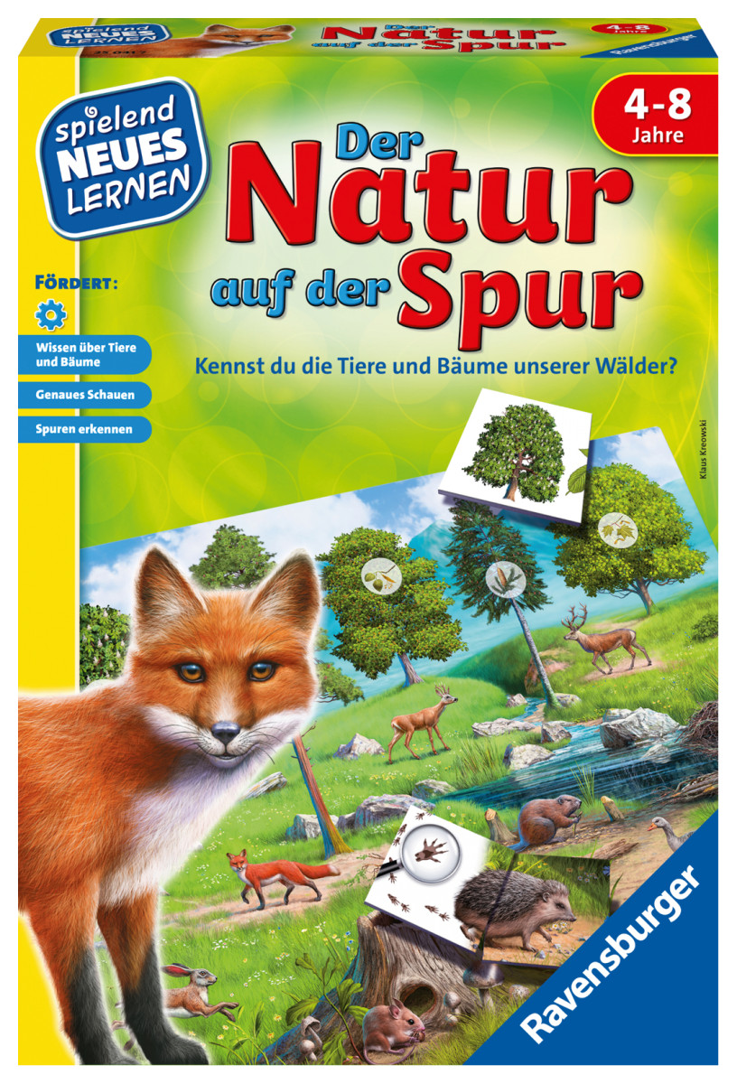 Der Natur auf der Spur D | Bei dem Kinderspiel 'Der Natur auf der Spur' lernt man viel über die Tiere und Bäume der heimischen Wälder. Die Kinder finden gemeinsam heraus, welche Spuren zu Fuchs, Reh, Waldmaus und Co. gehören. Die jungen Forscher müssen dabei sehr sorgsam sein, denn sonst wird die Zeitdrehscheibe weitergedreht, und die Tiere schaffen es nicht rechtzeitig zur Dunkelheit in Heimatwald. Falls alle Spuren erkannt wurden, haben die Spieler alle gemeinsam gewonnen.Logisches Denken und Konzentration sind gefragt. Als Variation können den Waldbäumen die passenden Blätter und Früchte zugeordnet werden. Das Wissen kann außerdem noch weiter ausgebaut werden, denn zusätzlich verraten die Karten weitere interessante Informationen zu den Tieren und Bäumen. Lernspiele, die richtig Spaß machen: So heißt das Motto der Lernspielreihe von Ravensburger, mit der Kinder in den lernintensivsten Jahren in ihrer Entwicklung unterstützt werden. Alle Spiele werden nach neuesten wissenschaftlichen und pädagogischen Standards entwickelt und geprüft. Die Lernstoffe sind in spannenden Geschichten verpackt, eine Vielfalt an Materialien und Methoden erlaubt das Lernen mit allen Sinnen. | Bei dem Kinderspiel 'Der Natur auf der Spur' lernt man viel über die Tiere und Bäume der heimischen Wälder. Die Kinder finden gemeinsam heraus, welche Spuren zu Fuchs, Reh, Waldmaus und Co. gehören. Die jungen Forscher müssen dabei sehr sorgsam sein, denn sonst wird die Zeitdrehscheibe weitergedreht, und die Tiere schaffen es nicht rechtzeitig zur Dunkelheit in Heimatwald. Falls alle Spuren erkannt wurden, haben die Spieler alle gemeinsam gewonnen. | - Eine Spur im Wald ist zu sehen. Doch die Frage ist, zu welchem Tier sie gehört. Fuchs, Reh, Eule und viele weitere Tiere laden zu einer spannenden Spurensuche ein. Das Lernspiel beinhaltet einen großen, naturgetreu gezeichneten Spielplan, - Mit viel Spielspaß tauchen die Kinder bei diesem Brettspiel in die heimische Tier- und Pflanzenwelt ein. Außerdem werden genaues Schauen und Spuren erkennen geübt, - Verschiedene Schwierigkeitsstufen werden unterschiedlichen Entwicklungs- und Altersstufen gerecht und ermöglichen eine individuelle Förderung der 4 bis 8 Jährigen, - Das Kinderspiel eignet sich für 2-4 Spieler und bringt Spannung in jedes Kinderzimmer. Das ideale Geschenk zum Geburtstag oder Weihnachten. Eine sinnvolle Beschäftigung für die Kleinen, um auch zuhause zu lernen und gleichzeitig Spaß zu haben, - „Spielend Neues Lernen“ unterstützt die Entwicklung der Kinder. Sie erwerben spielerisch Wissen und können persönliche Potentiale entfalten. Außerdem erlauben unterschiedliche Schwierigkeitsgrade und Selbstkontrollmechanismen individuelles und eigenständi. Lizenz: | Serie: Spiele | Preisbindung: N | Verkaufsverpackung: Karton | Geschlecht: Unisex | Spieleranzahl: 2 - 4 | Spieldauer: ca. 20 min | empf. Mindestalter: 4 Jahr(e) | empf. Höchstalter: 8 Jahr(e) | Zolltarifnummer: 95049080 | Ursprungsland: TSCHECHISCHE REPUBLIK | Sprache(n) Verpackung: DE | Sprache(n) Gebrauchsanweisung: DE
