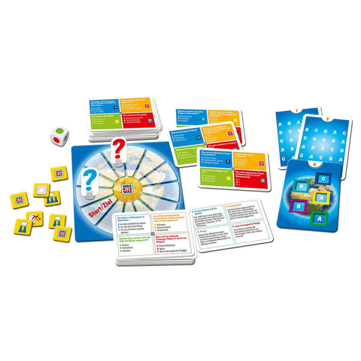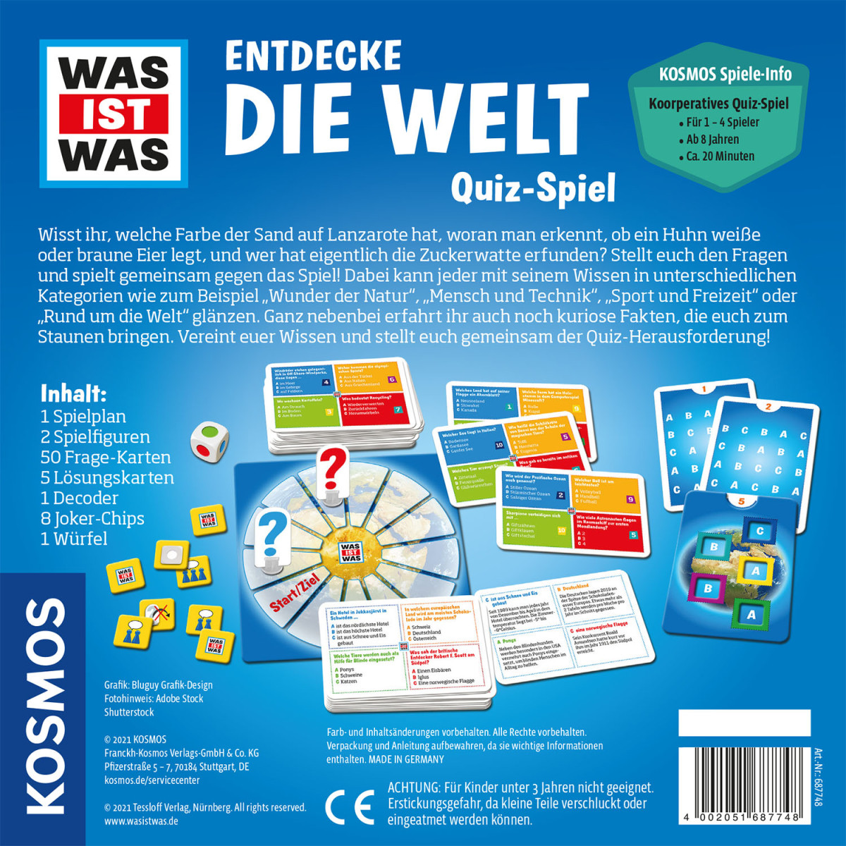 Wie sieht der Sand auf Lanzarote aus? Wer hat Zuckerwatte erfunden? Diesen und unzähligen weiteren Fragen aus fünf Kategorien gehen Kinder ab 8 Jahren gemeinsam im kooperativen Brettspiel nach. Tiere und Pflanzen, Geschichte, Technik, Wissenschaft und kluge Köpfe: der Würfel entscheidet, welcher Themenbereich zuerst drankommt. Frage richtig beantwortet? Die Decodierkarte hilft, die passenden Lösungen und Infos zu finden. Die Spielfigur darf weiterwandern. Und wenn die Frage doch zu schwierig ist? Dann helfen unterschiedliche Joker-Chips. Ein tolles Quiz und Familienspiel mit Lerneffekt für Groß und Klein! Das ideale Geburtstagsgeschenk. |. Lizenz: | Verkaufsverpackung: Kartonschachtel | Geschlecht: Unisex | empf. Mindestalter: 8 Jahr(e) | empf. Höchstalter: 12 Jahr(e) | Spieleranzahl: - | Spieldauer: 20 Min. | Zolltarifnummer: 95049080 | Ursprungsland: DEUTSCHLAND, BUNDESREPUBLIK | Sprache(n) Warnhinweise: DE | Verkaufsfähig in: