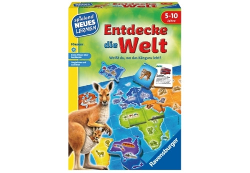 Entdecke die Welt D | In dem Kinderspiel 'Entdecke die Welt' stellen sich Fragen wie: Wo leben Zebra und Elefant? Wer kennt die Freiheitsstatue und wer weiß, wo die Pyramiden stehen? Viele Bilder laden 2-4 Kinder ein, die Erde zu entdecken und die Tiere den Kontinenten zuzuordnen. Die kleinen Entdecker vergleichen die Kärtchen mit dem Spielplan und finden die Orte der abgebildeten Motive. Anschließend vervollständigen die Kinder diese Bilder von Tieren oder Sehenswürdigkeiten, gewinnen so die meisten Punkte und nehmen den Sieg mit nach Hause.Dabei wiederholen sie ihre Zuordnung und prägen sich das Wissen über Geographie oder die Heimat der Tiere ein. Ganz ohne Text für eine erste Orientierung auf der Weltkarte oder mit zusätzlichen Informationen auf den Rückseiten der Motivkarten wächst das Spiel mit den Kindern mit. Lernspiele, die richtig Spaß machen: So heißt das Motto der Lernspielreihe von Ravensburger, mit der Kinder in den lernintensivsten Jahren in ihrer Entwicklung unterstützt werden. Alle Spiele werden nach neuesten wissenschaftlichen und pädagogischen Standards entwickelt und geprüft. Die Lernstoffe sind in spannenden Geschichten verpackt, eine Vielfalt an Materialien und Methoden erlaubt das Lernen mit allen Sinnen. | In dem Kinderspiel 'Entdecke die Welt' stellen sich Fragen wie: Wo leben Zebra und Elefant? Wer kennt die Freiheitsstatue und wer weiß, wo die Pyramiden stehen? Viele Bilder laden 2-4 Kinder ein, die Erde zu entdecken und die Tiere den Kontinenten zuzuordnen. Die kleinen Entdecker vergleichen die Kärtchen mit dem Spielplan und finden die Orte der abgebildeten Motive. Anschließend vervollständigen die Kinder diese Bilder von Tieren oder Sehenswürdigkeiten, gewinnen so die meisten Punkte und nehmen den Sieg mit nach Hause. | - Geografie-Spaß für Kinder: Wo leben Zebra und Elefant? Wer kennt die Freiheitsstatue und wer weiß, wo die Pyramiden stehen? Viele Bilder laden die Kinder ein, die Erde zu entdecken und die Tiere den Kontinenten zuzuordnen, - Die Spieler vergleichen die Kärtchen mit dem Spielplan und finden die Orte der abgebildeten Motive. Anschließend vervollständigen die Kinder diese Bilder von Tieren oder Sehenswürdigkeiten und gewinnen so die meisten Punkte, - Dieses schöne Brettspiel fördert: erstes Wissen über Kontinente, das Vergleichen und Zuordnen, - Das Lernspiel eignet sich für 2-4 Spieler und bringt Spannung in jedes Kinderzimmer. Das ideale Geschenk zum Geburtstag oder Weihnachten. Eine sinnvolle Beschäftigung für die Kleinen, um auch zuhause zu lernen und gleichzeitig Spaß zu haben, - „Spielend Neues Lernen“ unterstützt die Entwicklung der Kinder. Sie erwerben spielerisch Wissen und können persönliche Potentiale entfalten. Außerdem erlauben unterschiedliche Schwierigkeitsgrade und Selbstkontrollmechanismen individuelles und eigenständi. Lizenz: | Serie: Spiele | Preisbindung: N | Verkaufsverpackung: Karton | Geschlecht: Unisex | Spieleranzahl: 2 - 4 | Spieldauer: ca. 20 min | empf. Mindestalter: 5 Jahr(e) | empf. Höchstalter: 10 Jahr(e) | Zolltarifnummer: 95049080 | Ursprungsland: TSCHECHISCHE REPUBLIK | Sprache(n) Verpackung: DE | Sprache(n) Gebrauchsanweisung: DE