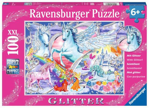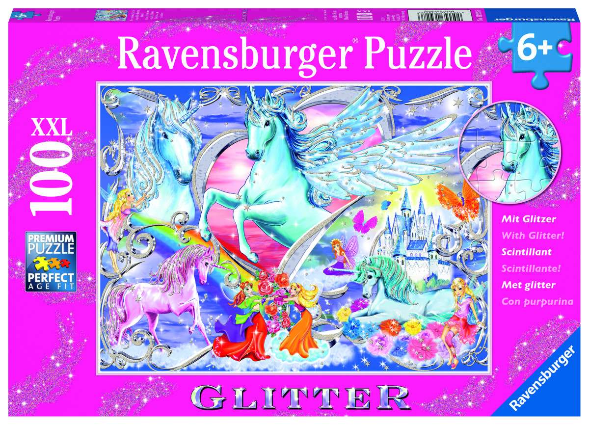 Die schönsten Einhörner 100p | Glitzernder Puzzlespaß im XXL-Format! Die Ravensburger Glitterpuzzles sind ganz besondere Puzzles: Wie von zauberhaftem Feenstaub überzogen funkeln und glitzern liebevolle Details der Glitter-Puzzle-Motive und begeistern kleine Puzzlerinnen und Puzzler. Die Glitzerpuzzles mit 100 Teilen im XXL-Format sind ideal für Mädchen und Jungen ab 6 Jahren und sorgen für ein schimmerndes Puzzlevergnügen!Teile suchen, anfügen und sich über das immer größer werdende Bild freuen - Puzzeln ist, wenn sich ein kleiner Erfolg an den anderen reiht. Deshalb lieben Kinder es, die Puzzleteile immer wieder zu ihren Lieblingsmotiven zusammen zu setzen. Doch Puzzles bieten mehr als Spaß: Mit der richtigen Schwierigkeit gewählt, lassen sie Kinder jeden Alters an den Herausforderungen wachsen, erhöhen ihre Geduld und stärken ihr Selbstvertrauen. Die Auswahl der richtigen Motive und die hohe Qualität unserer Kinderpuzzles liegen uns sehr am Herzen. Deshalb wird die Unbedenklichkeit aller Materialien sowie des Glitzerlacks von einem unabhängigen Institut bestätigt. Seit mehr als 100 Jahren entwickeln wir Puzzles, wie Kinder sie lieben: altersgerecht in Motiv, Teilezahl und -größe. | Glitzernder Puzzlespaß im XXL-Format! Die Ravensburger Glitterpuzzles sind ganz besondere Puzzles: Wie von zauberhaftem Feenstaub überzogen funkeln und glitzern liebevolle Details der Glitter-Puzzle-Motive und begeistern kleine Puzzlerinnen und Puzzler. Die Glitzerpuzzles mit 100 Teilen im XXL-Format sind ideal für Mädchen und Jungen ab 6 Jahren und sorgen für ein schimmerndes Puzzlevergnügen! | - Das beste Puzzle für Kinder die Puzzeln und Glitzer lieben! Mädchen und Jungen ab sechs Jahren können mit diesem schimmernden Kinderpuzzle in eine zauberhafte Welt eintauchen. Durch die glitzernden Details funkelt das XXL-Puzzle ganz besonders, - Ravensburger Kinderpuzzle sind das beste Geschenk zu jedem Anlass: Geburtstag, Weihnachten, Ostern oder einfach als tolle Freizeitbeschäftigung, - Kinderpuzzles sind das ideale Spielzeug für Kinder jeden Alters: Puzzles unterstützen spielerisch die Entwicklung der Kinder und wirken sich positiv auf Motorik und Konzentration aus, - Ravensburger Qualitätsprodukte bestehen aus extradickem, langlebigem Material und ermöglichen so langen Puzzlespaß. Die Größe der Puzzleteile ist der Altersangabe angepasst und liegen den kleinen Puzzlern gut in der Hand, - Das Produkt beinhaltet ein 100 Teile XXL Ravensburger Kinderpuzzle mit Glitzer-Details im Format 49 x 36 cm für Mädchen und Jungen ab 6 Jahren. Lizenz: | Serie: Puzzles | Preisbindung: N | Verkaufsverpackung: Karton | Geschlecht: Unisex | Spieleranzahl: - | Spieldauer: ca. min | empf. Mindestalter: 6 Jahr(e) | empf. Höchstalter: Jahr(e) | Zolltarifnummer: 95030069 | Ursprungsland: DEUTSCHLAND, BUNDESREPUBLIK | Sprache(n) Verpackung: DE, NL, EN, FR, IT, ES | Sprache(n) Gebrauchsanweisung: DE,EN,FR,ES,IT,NL