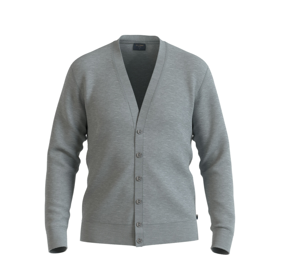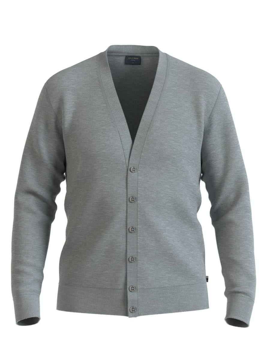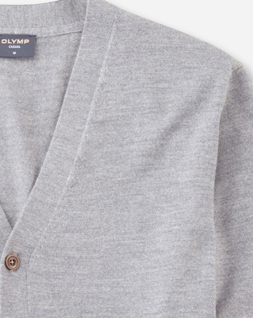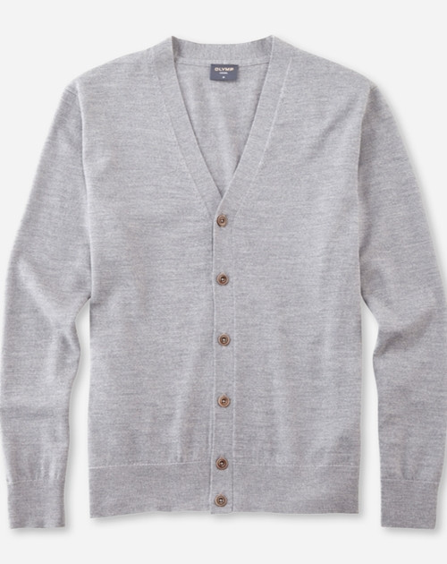 Ob als Office-Wear oder privat getragen: Mit seiner eleganten Strickqualität ist dieser Cardigan ein vielseitiger Klassiker. Für den leichten Single-Jersey wurde 100 Prozent feinste Merinowolle verarbeitet. V-Ausschnitt, Knopfleiste, Armabschlüsse und Saum sind jeweils mit Strickbündchen versehen. Ein OLYMP Casual Essential in Silbergrau.